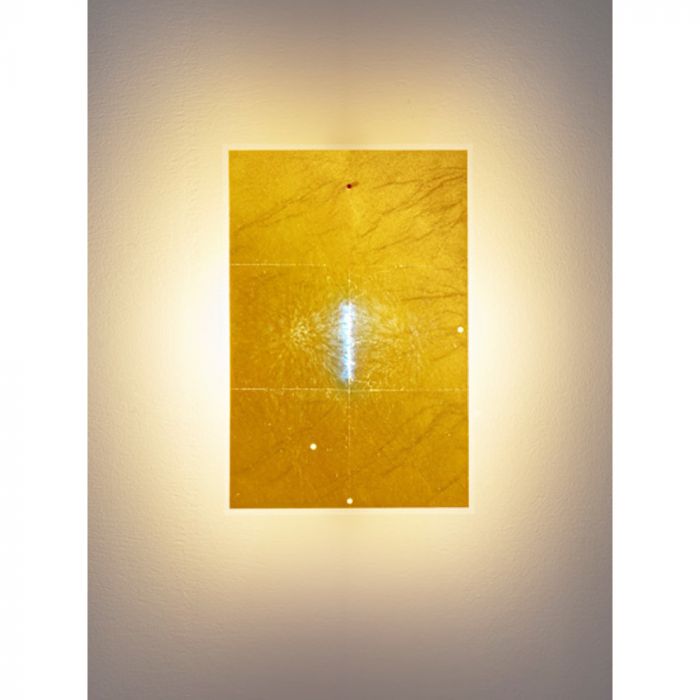 24 Karat Blau Flat is the latest member of the 24 Karat Blau family. The very flat wall light is based on an acrylic glass panel into which gold leaf is cast and which is mounted directly in front of the light source. The wafer-thin gold only allows short-wave blue light to pass through, so that the light point of the luminaire has a bluish shimmer Warm, golden yellow light is reflected by the gold layer, creating a wonderfully warm atmosphere.