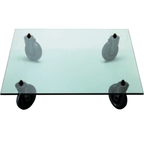 The Tavolo Con Ruote is a coffee table with a float ground-glass top (0.6" thick). It also has industrial casters with black-painted metal brackets.