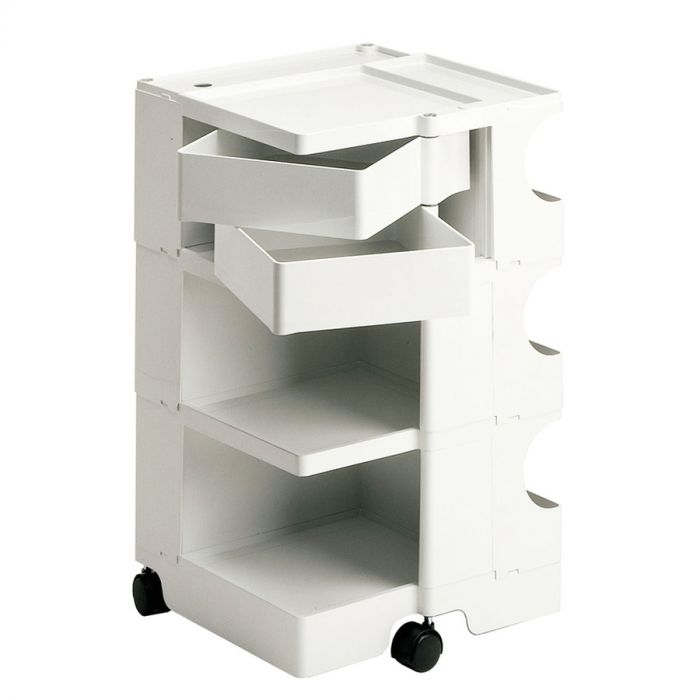 Joe Colombo’s Boby Organizer features three levels and two drawers — the perfect storage container on casters for your business or home office. Unclutter, simplify, and organize your workspace with this versatile mobile cart. With a height of 29.25", it tucks neatly under most tables or alongside your desk. Several trays hold paper, envelopes, stamps, paperclips, pens, calculators, invoices, and more. The side panels can be removed to store posters and tubes, making it an ideal organizer for architects, designers, and artists. Built from heavy-duty ABS plastic, this piece is sturdy and long-lasting — a must-have for home and office environments alike.