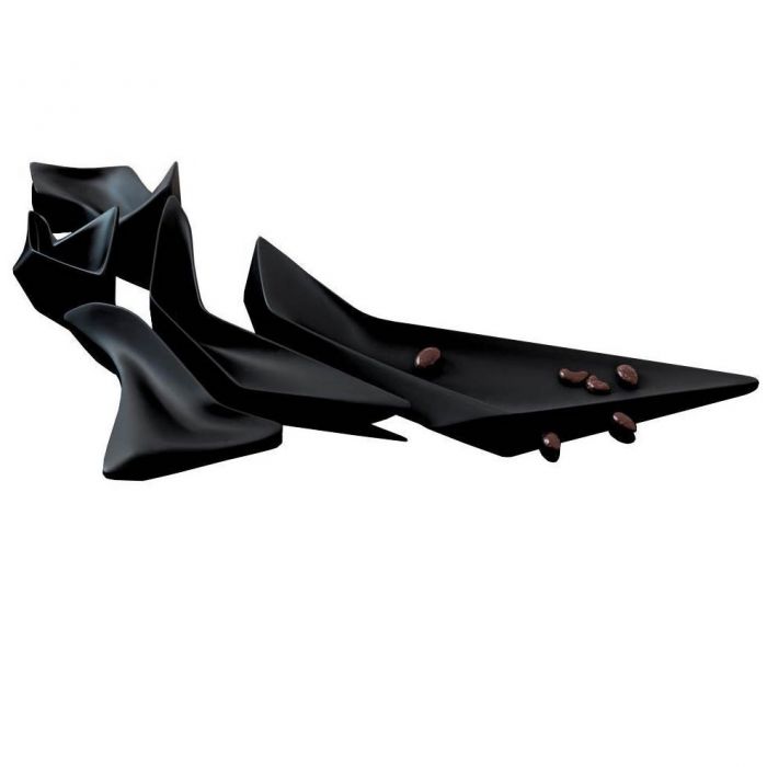 "Niche" can quite simply be considered a domestic sculpture. The composition of formally complex pieces results in a unique and sinuous dovetail effect. As soon as you see "Niche" you want to take a piece in your hands so you can feel what to the eye appears to be an attractive, sinuous and velvety object. It can be a centrepiece made up of 5 pieces, each of which can be used as an individual receptacle for sweets or chocolates, or it can be used on a desk to hold office stationery and pens. Niche" is produced from black melamine and has a smooth, matte finish that makes the pieces both pleasing to the touch and easy on the eye. An image of the composition, designed to act as a guide, is found underneath the base of the object together with the Officina Alessi logo and the name of the designer.