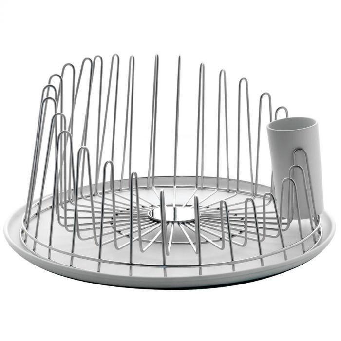 Looking for a beautiful modern dish rack? Alessi A Tempo Stainless Steel Dish Rack Drainer with Optional Tray by Pauline Deltour for Alessi Italy. Alessi's wire dish drainer neatly organizes your dishes in style for drying after they have been washed. This gorgeous Italian-made dish rack will add a contemporary finish to any kitchen sink area. Round in design, the "A tempo" dish drainer looks contemporary and modern and is unlike any other dish drainer that can be found on the market today. Included with the Alessi dish drainer is a cutlery drainer in thermoplastic resin. It holds plenty of plates, cups and saucers measuring up to 12" each, and has an optional removable white bottom tray that catches the water. Functional, simple and decorative Alessi design object from Stardust.