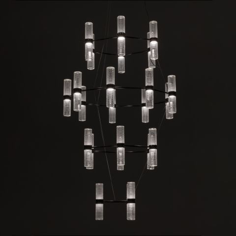 It is a contemporary interpretation of the traditional chandelier: the craftsmanship of the glass is combined with a simple shape and an optical flair to reinterpret glass processing technologies, not just through decorative pieces, but also as functional tools for controlling and distributing light.