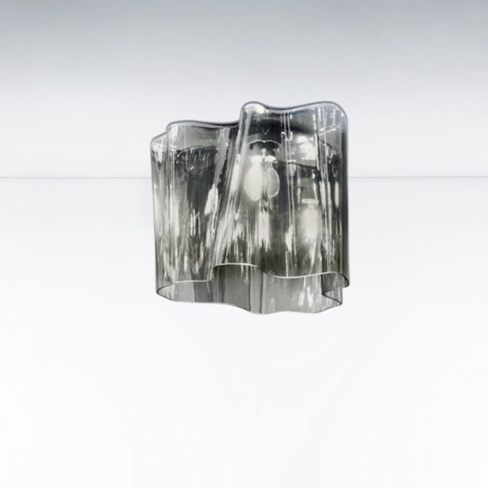 The Logico series was Michele De Lucchi and Gerhard Reichert for Artemide in Italy. The fluidity of the diffuser captures the essence of the Logico ceiling lamp. The light dances on the interior surface of the hand blown glass with satin finish. This is a ceiling mounted luminaires for diffused incandescent and fluorecent lighting for applications with a single diffuser unit. The ceiling light diffuser supporting frame is in die-cast aluminum with pale grey matte lacquer finish. Ceiling canopy is in steel with pale grey thermoplastic cover, mounting to standard electrical junction box.