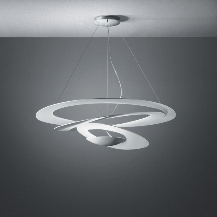 The Pirce is a cable suspension mounted luminaire for indirect halogen lighting designed by Giuseppe Maurizio Scutellà for Artemide.Artemide's Pirce lamp is the winner of the prestigious 2009 Red Dot Design Award! The structure of the Artemide Pirce lamp is in aluminum with a white finish. One continuous slender piece of aluminum is used to create a unique spiral. The ceiling canopy is in steel with a thermoplastic cover, and suspension cables are in stainless steel. The Artemide Pirce pendant lamp mounts onto standard electrical junction boxes. The Pirce pendant lamp has a spectacular lighting system, engineered in a way that the spirals of the lamp cast no shadows and only disperses light indirectly.