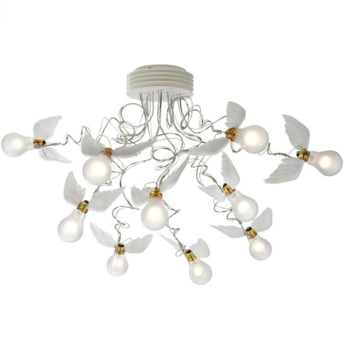Ingo Maurer Birdie's Nest Ceiling Lamp aka the Birds Nest Lamp by Ingo Maurer. Designed by Ingo Maurer, this ceiling light is part of the collection of Bird lamps by Ingo Maurer. The Birdie's Nest Ceiling Lamp is a stunning unique modern piece from Ingo Maurer! Birdie's Nest, designed by Ingo Maurer, is a visually stunning & brilliant conversation piece. Each light bulb is attached to its own set of goose feather wings, each in its own bid to escape. Inspired by the iconic form of the incandescent bulb. A variation on the Birdie Chandelier, the Ingo Maurer Birdie's Nest Ceiling Light gives the same winged incandescent bulbs a place to live. With snowy white goose feather wings, 10 incandescent bulbs (with halogen insides) take flight from their central housing. Designed for the ceiling, the Birdie's Nest can also be installed on the wall. Once you unpack your Birdie or Birdie’s Nest, it is up to you to determine the final form! The light bulbs for all models of the Birds-family are custom-made for Ingo Maurer GmbH. In order to extend the life span of these bulbs, it is recommended to use a wall dimmer. Quick, the lights are flying away! Complete with bulbs plus 2 spares. Not suited for rooms with high humidity. Dimmer recommended