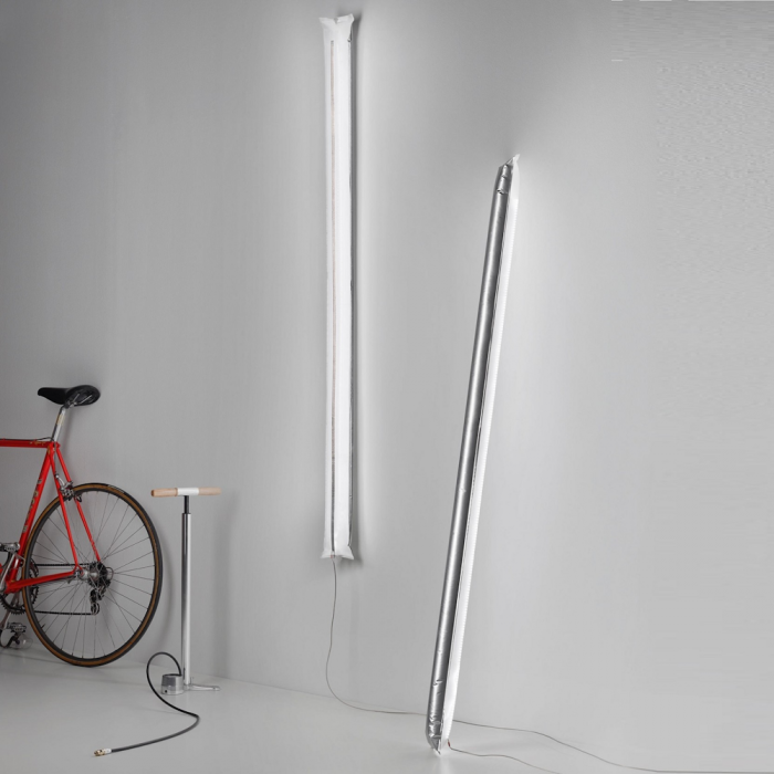 Blow Me Up can be used flexibly: leant against the wall, placed on a shelf or on the floor; Blow Me Up quickly and easily brings glare-free light to the places where it is needed. The tube is supplied rolled up in a tin can and can be inflated by the user in just a few minutes. A sensor switch is attached to the cable side of the LED strip. This allows Blow Me Up to be switched and dimmed. The LED light sources illuminate the reflective inside of the tube and thus diffuse indirect light in the room.
