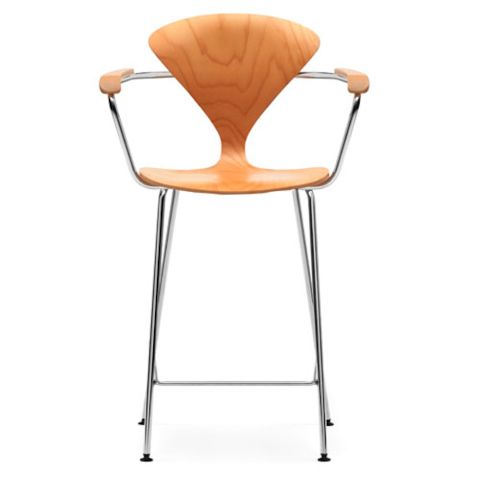 Available in bar and counter heights for home or hospitality environments. Metal Base Stools with Arms have a molded plywood shell of graduated thickness with a bright chrome base. The arm is bright chrome with a solid wood armrest. The authentic licensed design is produced by The Cherner Chair Company from the original drawings and molds. Sustainably made in the U.S.A.