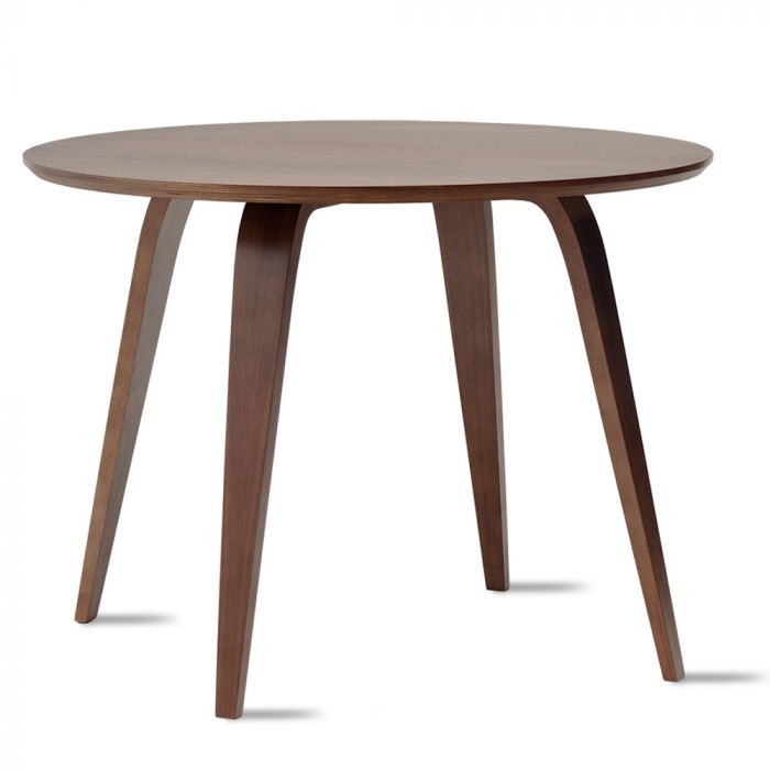 The curves of the Cherner Chair are translated into the graceful minimalist design of the Cherner Round Table. Available in 48" or 40" diameters. The top is made of 1-1/8" thick cross-ply plywood featuring hardwood veneers with a tapered profiled exposed edge. The legs are molded laminated wood with exposed plys with a hardwood veneer. The authentic licensed design, sustainably made in the U.S.A.