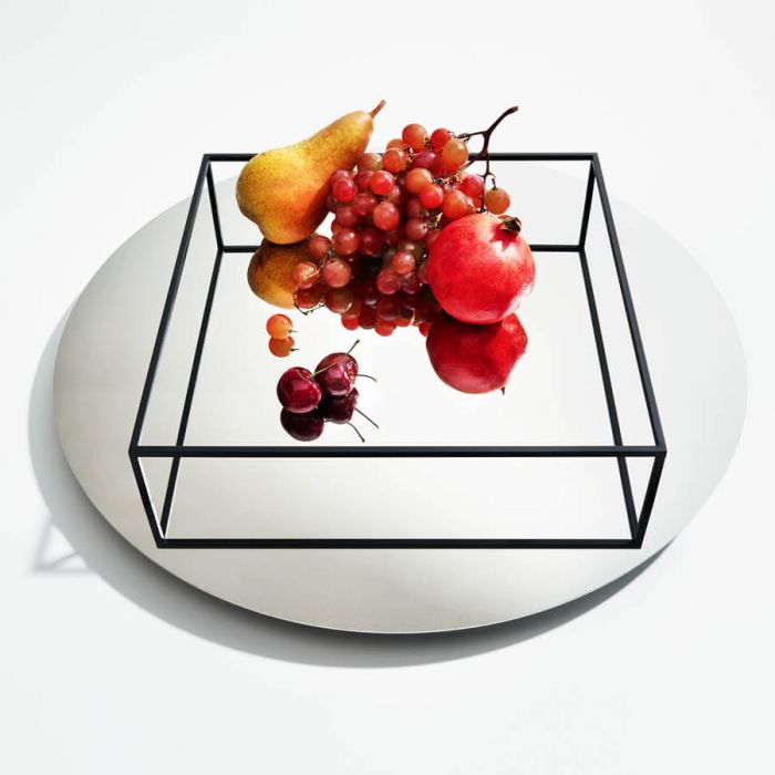 Danese Milano Ron Gilad (Circle or Oval) "Surface+Border" cutting edge modern fruit serving- and centerpiece trays that play with sleek contrasting shapes and reflections. These ultra contemporary round or oval-shaped serving trays in red or black accommodate a mixed assortment of snacks, beverages, containers, and personal articles. Surface + Border n. 1 and n. 2 trays were designed with a a minimal amount of elements ambiguously playing with the object's identity, suspended between a tray and a fruit bowl (dish). The container's outline is marked by thin metal lines leaning on an oval or round mirror.