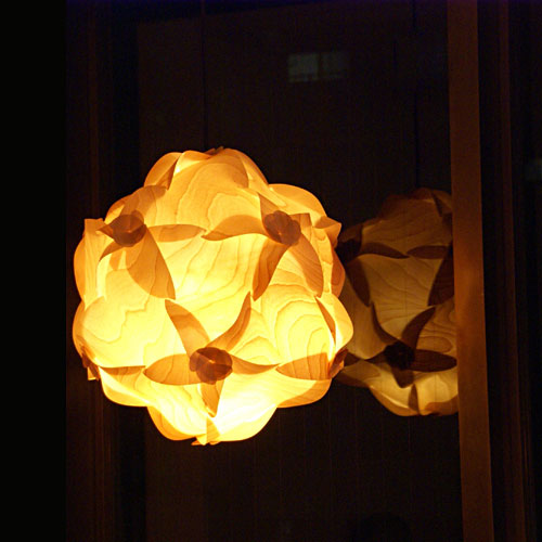Are you curious about our unusual yet beautiful wooden pendant light kit? We bet you are! With our creative DIY flat-packed pendant light, you do not need to look any further. Each fixture is made of natural wood, no two are alike, and the light emitted has a warm glow reminiscent of candlelight. If you get tired of the same shape you can re-assemble the lamp in a different shape, exactly like a puzzle. The easiest shape is the this beautiful sphere as pictured but you can also create a saucer-shaped light! A flat packed light kit includes instructions for self assembly. Enjoy creating your own light with this attractive idea for home lighting that emits a beautiful warm light. These pendant lights are sold and shipped in flat-pack kits of 20 triangular pieces that have notches cut into them. The modular forms are laminated with clear polypropylene, making them durable, resistant to heat and easy to clean. If you do rip one though, simply send off for another kit since each piece is interchangeable and can be swapped out easily. The design is completely up to you, but the large orb is one of the most popular and versatile designs. Makes a great lamp for the home. For indoor use only.