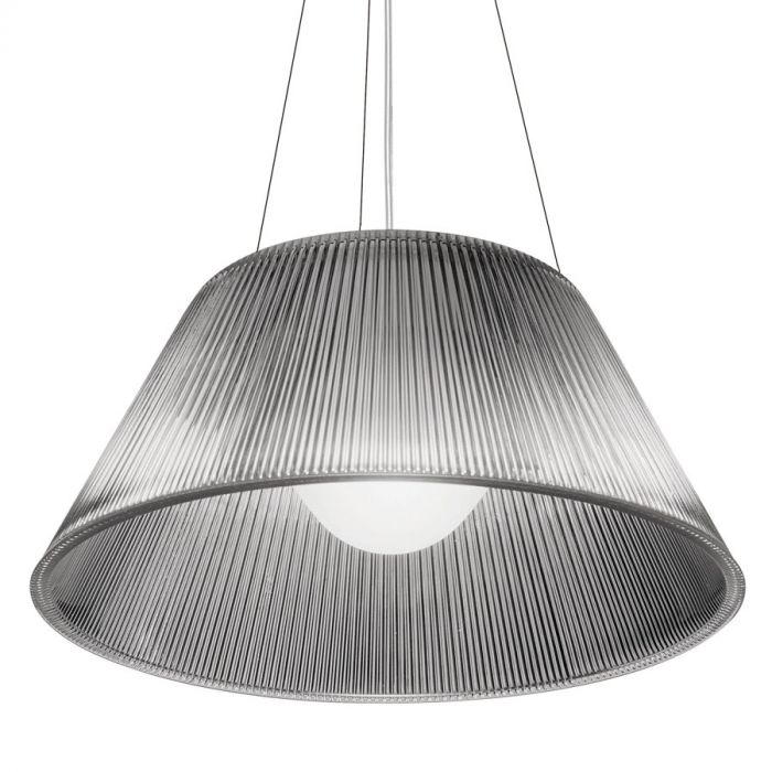 Flos Romeo Moon S2 Large Reeded Glass Pendant FU611000. Flos Romeo Moon S2 by Philippe Starck. The Romeo Moon S2 Pendant Light by Flos Lighting from Stardust embody the spirit of Philippe Starck's romantic style, the decorative S2 Romeo Moon pendant features a simple, clear glass shade that is both decorative and timeless. The wonderful Romeo Moon lamps are characterized by a tasteful beauty of form and functionality. They are perfect for any interior and they provide a wonderful light: Romeo Moon S2 diffuses a bright wash of downward illumination and creates an overall sparkling ambient light that is sufficient when used as reading light. The glass lampshade is made with reeded clear glass in borosilcate and the internal diffuser is etched white glass which diffuses the light (no direct harsh light). Supported by three steel cables and a white 6.8" dia ceiling cap, Romeo Moon S2 is a smart choice for interior home lighting but also when used to brighten up offices, hotels, bars and restaurants.