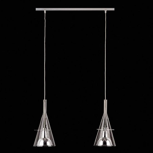 The light, designed by Franco Raggi, consists of two borosilicate glass diffusers with internal chrome-plated aluminum reflectors and two transparent (metallic) power cables. The diffusers have 20" space between each other.