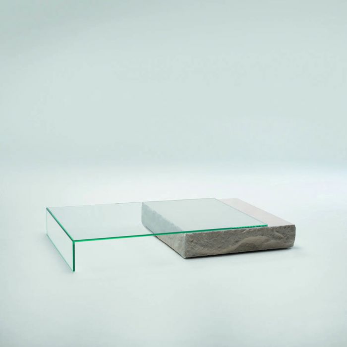 Low table composed of a parallel-piped Limestone block and a tempered 15 mm thick extra-light glass element with 45' angles that rests on top. The sides of the stone have a split-face, raw finish and the glass top is flamed and smoothed.