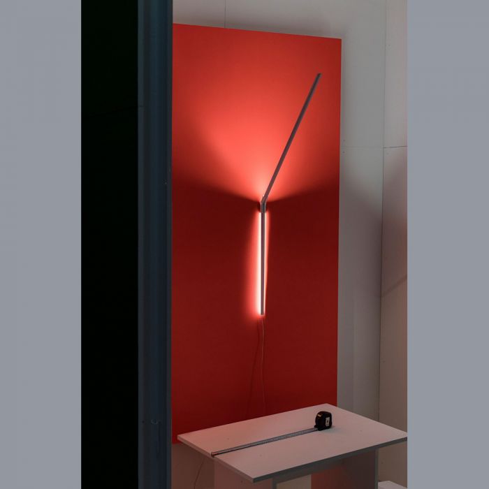 The lamp is made from the elasticated sheet metal of a tape measure. The back of the concave surface is provided with a strip of light that extends along its entire length. Attached to the wall with a transparent bracket, this luminaire emits a bright and graphic band of light that gives off an enchanting glow, adding depth to the surrounding space.