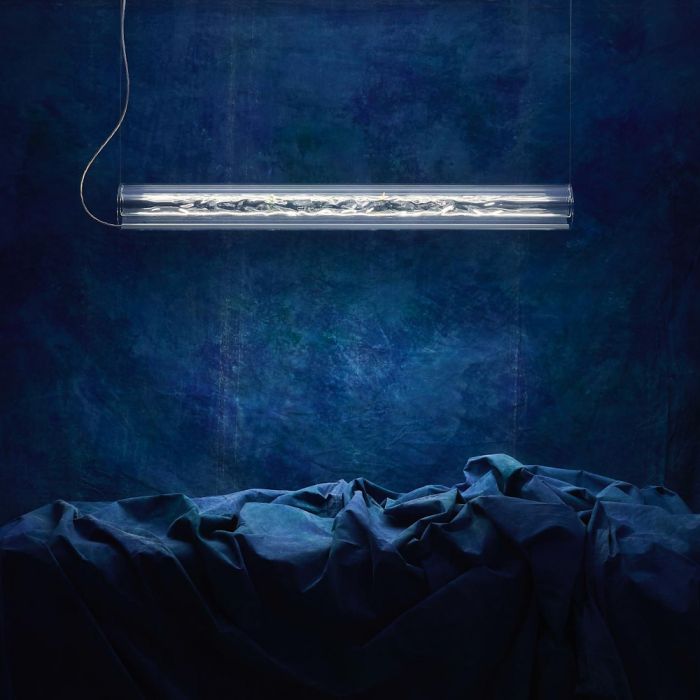 NALUM captures the dynamic motion of waves and the light reflection on the water's surface in an extraordinary light object. Its centerpiece is a floating, wave-shaped glass tube, which creates fascinating light lines through multiple reflections. The outer linearly shaped glass tube houses the light source, which is fixed by magnets and offers both upward-facing uplight and downward-facing downlight. Both light sources are independently dimmable, allowing for the creation of individual lighting moods.