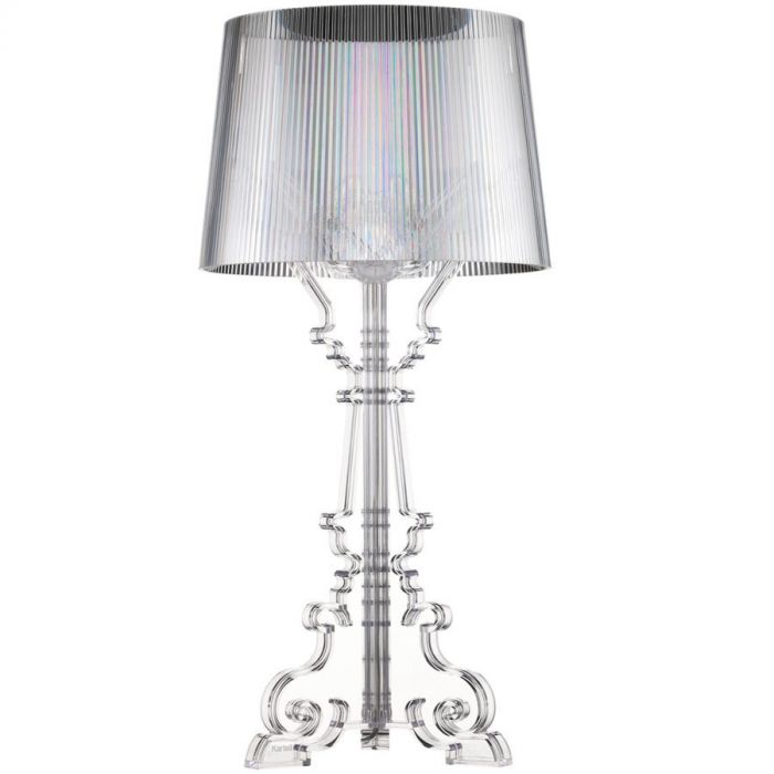 Kartell Bourgie Lamp. Are you shopping for a new modern table lamp? The Bourgie Table Lamp was designed by Ferrucio Laviani for Kartell in Italy. A lamp with incredible appeal, Bourgie is one of Kartell's best selling table lights, artfully combining Baroque style, rich ornamentation with Italian styling. The contemporary Bourgie was designed by Ferruccio Laviani for Kartell in Italy. The revolutionary feature of the Bourgie lamp is that it is made entirely out of polycarbonate in either transparent or plated finishes. On the one hand, the Bourgie lamp is classical, rich and traditional, and on the other, it is innovative, transparent and ironic. The Baroque style base is composed of three decorated layers that interconnect, and the large lampshade is make with a plissé effect, to create a myriad play of reflections once the lamp is turned on. Thanks to a special coupling system on the lampshade, it can be assembled at three different heights: 26.75", 28.75" or 30.75". The lamp can be used as a table, desk or floor light and features a touch-sensitive dimmer. Uses 3 light bulbs (included). A little piece of contemporary Baroque art for your table top.