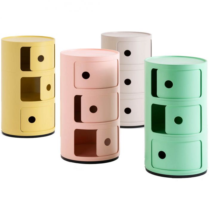 Kartell Componibili 'Bio' Bed- and Bathroom Storage in Pastel Colors by Kartell made from 100% renewable raw materials (vegetable waste from beetroot sugar and sugar cane production) which, with the addition of microorganisms, form a material similar to plastic. Design icon (creation date 1968) - Indoor / outdoor-compatible - Made in Italy - Exhibited at the Museum of Modern Art in New York and the Pompidou Centre in Paris - 3 drawers with sliding doors - Made in Italy.