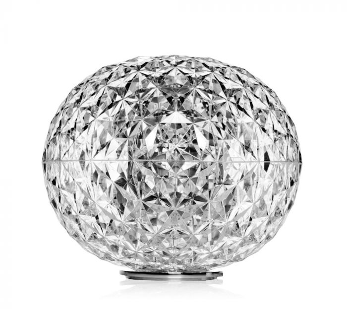A family of lamps: suspended, for a coffee table and with a metal structure, and the most recent floor version of the lamp is available in two heights: 130 and 160 cm. The distinctive trait is the shape of the slightly elliptical transparent diffuser, which is characterised by a multi-faceted surface, both inside and out, which creates a rich tapestry of reflections.
