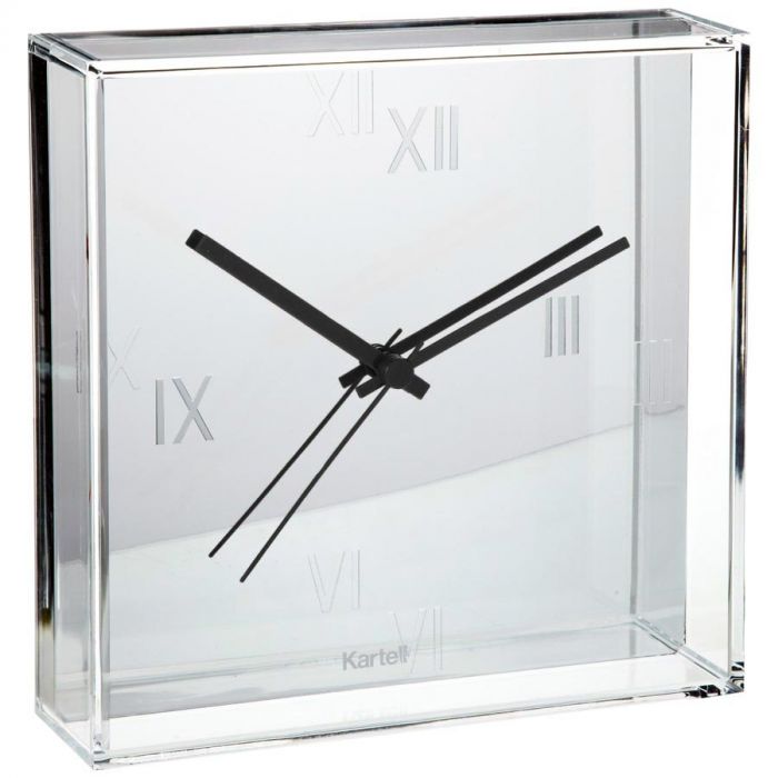 Kartell Tic Tac Clock. Are you shopping for a new modern wall clock? The Tic Tac clock was designed by Philippe Starck and Eugeni Quitllet for Kartell in Italy. A super clean minimal design with a square shape by the French designers who are known for their fresh take on modern design. The transparent frame of the Tic & Tack clock gives it a wonderful contemporary look. Roman numerals engraved on the surface encloses a flat clock face and comes in three versions (white, black or chrome). This new Kartell clock features three thin colored hands for a chromatic synthesis transforming time into an aesthetic experience. The very attractive contemporary clock is makes the perfect statement for the business, home office, kitchen, living room, study, etc. Kartells first ever wall clock, a stylish new time piece by Italian design house! 1 AA battery included.