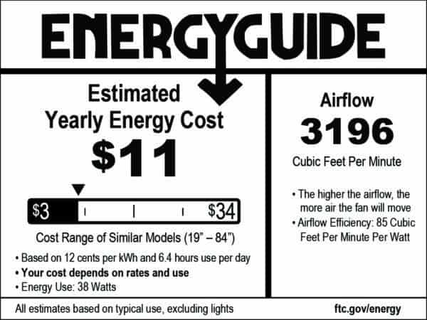 Ceiling fan manufacturers are required by federal law to publish an EnergyGuide label for all models in a standardized format, including watts used, cubic feet of air moved per minute (CFM), a resulting CFM per watt efficiency value and an estimated annual cost to use the product. These values are “weighted averages” of high and low speed performance and are intended to represent typical use. They are based on results from a standardized test gathered in a controlled environment and are furnished to help consumers and specifiers compare products. Because the standardized test method and the EnergyGuide format has changed over the years (with significant impacts on resulting data), be sure to only compare information which has been published based on current test methods and EnergyGuide label format. Many websites continue to provide “high speed” performance data instead of the more current “weighted averages”, making for large discrepancies. Please contact our customer support team with questions about performance data.