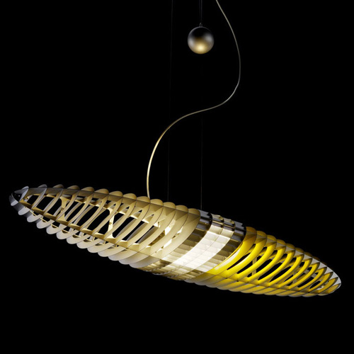 The Titania pendant lamp was designed by Alberto Meda and Paolo Rizzatto for Luceplan in Italy. The elliptical structure of its outer casing, composed of blades, serves simultaneously as a non-glare screen, a reflector of the central light source and a heat diffuser. Five pairs of polycarbonate interchangeable filters determine the varying colors of its lamellar body. In fact Titania can be colored as desired, by a simple movement of the hand to slot the different filters in and out and to give the lamp a ҤematerializedӠcolor - while always maintaining an emission of white light! A touch of the fingers is enough to send it into a variety of suspended positions and, depending on which angle it is seen from, it assumes completely different appearances: transparent if seen from the front, and as a solid body if seen from the side. The spherical counterweight, allowing its up-down adjustment, can be inserted or removed at any time. Titania is a dynamic and surprising lamp, suitable for a wide variety of settings. Thanks to its very light aluminum body, it can be hung from plaster, wood or sloping ceilings. The versatility of its components enables it to be attached to any part of the ceiling with no need for an already installed mains plug.