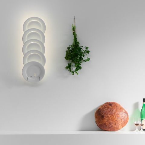 Jasna Kuchnia transforms a simple plate holder into a fascinating light object. The wall lamp consists of five white porcelain plates arranged on top of each other. A narrow LED line, mounted behind the plates, gently illuminates the porcelain. The light refracts in the material and is reflected in finely graded brightness levels. A dynamic interplay of light and shadow is created.
