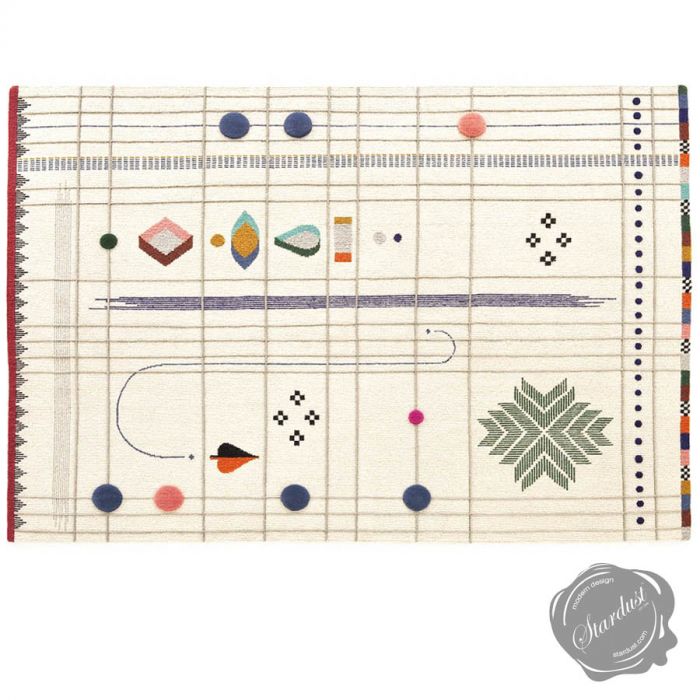 Nanimarquina Rabari 1 Rug by Nipa Doshi and Jonathan Levien, a beautiful combination of old world textile craft and modern graphics. For almost 1,000 years, the Rabari have roamed the deserts and plains of what is today western India. The Rabari women dedicate numerous weeks to create these exquisite area rugs, a vital and evolving expression of their crafted textile tradition. The Rabari collection by Nanimarquina consists of three carpets made from 100% New Zealand wool, handmade in India by using the hand knotted and hand woven Sumak techniques. Beyond the exceptional beauty that gives the bright color of the wool curl, the Rabari are three rugs (two in beige and one in black) with an outstanding design, a canvas on which Doshi Levien have designed a refined combination of rhythms with a unique graphic sensuality. The tribal Rabari Rugs for nanimarquina evokes the sensual and shiny world of tribal folk embroidery of India.