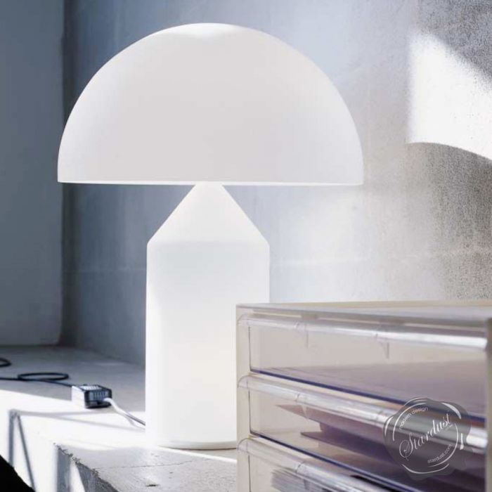 New Atollo Table Lamp (13.8|19.7|27.6 inches height) in white mouth-blown Murano glass, round shape, an original made-in-Italy design by Vico Magistretti (1977) for Oluce (mod. 235|236|237, USA edition/UL listed). Oluce's modern style white Atollo Italian glass small/medium/large table lamps are characterized by their luminous dome-shaped lamp shade which floats like an atol on it's round base. This stylish all-glass edition of the authentic Atollo lamp features a translucent satin white (opaline opaque) glass diffuser shade and lamp base for soft & warm diffused lighting. You can use it for adding atmosphere in your living- or bedroom when placed on end tables or on a bedside table.