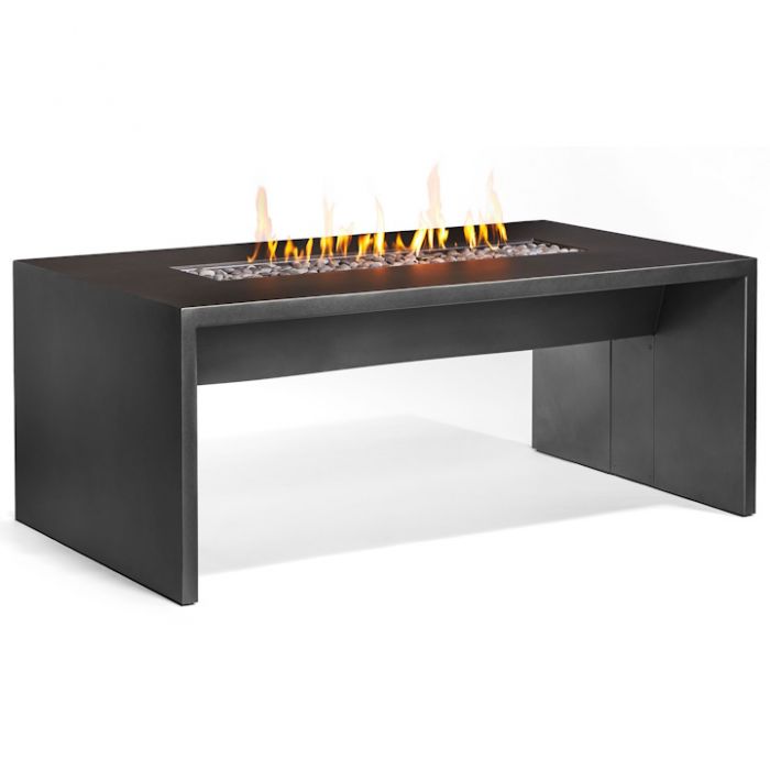 Nimbus firepit table is 72” x 42” x 29” tall (1829 x 1067 x 727 mm) and is made of heavy gauge, durable, powder-coated aluminum. Its fire is a 36” (914 mm) linear burner that can be fuelled by natural gas or propane. The fire pit element can be covered when not in use with the flush burner cover.