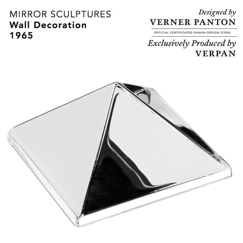 Wall decoration with one pyramid in chrome plated acrylic (PMMA). Also available with four or nine pyramids. Stardust Modern Design is an Authorized Dealer for the Verpan Collection. All Verner Panton products offered through Stardust Modern Design are licensed and manufactured by Verpan.