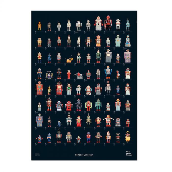 The R.F. Robot Collection Poster showcases 80 vintage robots manufactured in Japan between 1937 and 1973, offering a fascinating glimpse into the personal collection of Rolf Fehlbaum, Chairman Emeritus of Vitra. Referred to by Fehlbaum as “small kinetic sculptures of great originality,” these figures reflect the playful and imaginative spirit of mid-century robot design.