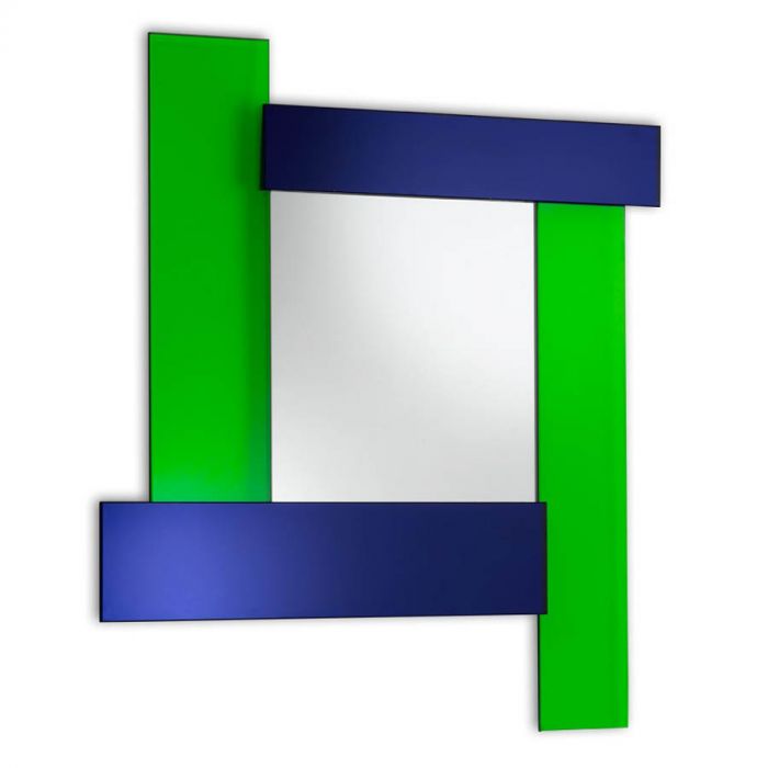 Glas Italia Ettore Sottsass Mirror DIONISO2 Gli Specchi di Dioniso with green-blue mirror glass. Adding an architectural touch to any room or commercial space, the Glas Italia Ettore Sottsass Mirror DIONISO2 Gli Specchi di Dioniso is a fitting choice for any decor. The Glas Italia Wall Mirror DIONISO2 was designed by Ettore Sottsass and is made by Glas Italia in Italy. This artistic Italian mirror is part of the "Gli Specchi di Dioniso" wall mirror collection by Ettore Sottsass. Ettore Sottsass is known the world over as one of the initiators of the revolution in architecture and design. This mirror features polychromatic frames composed of elements in laminated colored mirror, colored laminated glass and lacquered glass. The square mirror face is echoed by four smaller mirrors in different colors along the interior perimeter. This provides an unusual degree of visual complexity, as multiple planes of space are subtly refracted without disturbing the large, placid mirror surface in the center. The simplicity of the design is balanced by the warmth of the colors, making it a modern piece that can suit virtually any interior.