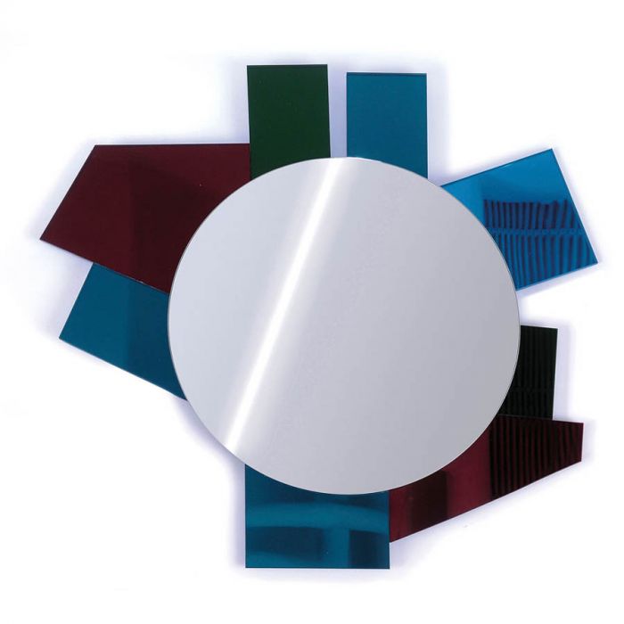 Contemporary modern wall mirror as featured in Elle Decor. This artistic Italian mirror is part of the "Gli Specchi di Dioniso" wall mirror collection by Ettore Sottsass. The Glas Italia Wall Mirror DIONISO6 was designed by Ettore Sottsass and is made by Glas Italia in Italy. Ettore Sottsass is known the world over as one of the initiators of the revolution in architecture and design. This mirror features polychromatic frames composed of elements in laminated colored mirror, colored laminated glass and lacquered glass. The round mirror face is echoed by various smaller mirrors in different colors along the interior perimeter. This provides an unusual degree of visual complexity, as multiple planes of space are subtly refracted without disturbing the large, placid mirror surface in the center. The simplicity of the design is balanced by the warmth of the colors, making it a modern piece that can suit virtually any interior. Adding an architectural touch to any room or commercial space, the Glas Italia Ettore Sottsass Mirror DIONISO6 Gli Specchi di Dioniso is a fitting choice for any decor.
