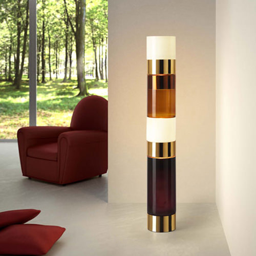 Floor lamp composed of assembled blown glass cylinders in various color ways and four sizes. Metal base available in polished chrome. The color combination for this lamp are White, Gold Mirror, Tobacco, White Gold Mirror Black/White Inside.