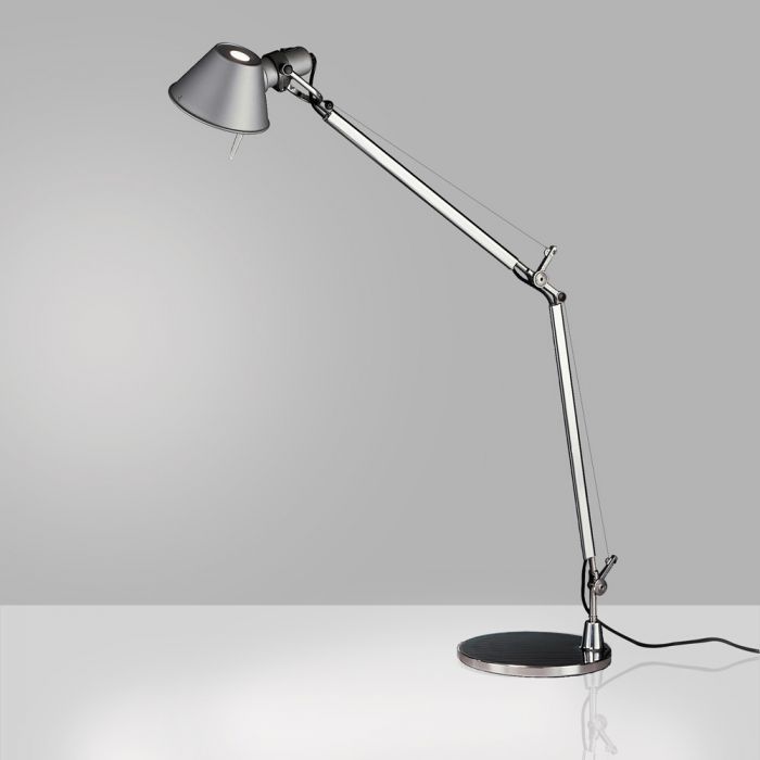 The Tolomeo lamp is fully adjustable and provides an infinite number of ways to direct the light. The Tolomeo lamp has therefore become one of the most popular desk lamps since it combines design with functionality. The aluminum diffuser of the Tolomeo lamp can swivel 360 degrees and easily turns with the cool-to-the-touch steel tip. The Tolomeo lamp has a fully adjustable, articulated arm body structure in extruded, brilliant, natural anodized aluminum finish. Joints and tension control knobs and mountings in polished die-cast aluminum. The cables are made in stainless steel, with a 6" diameter diffuser in stamped, anodized matte aluminum, tiltable and 360 degrees rotatable on lamp holder with incorporated on/off switch.