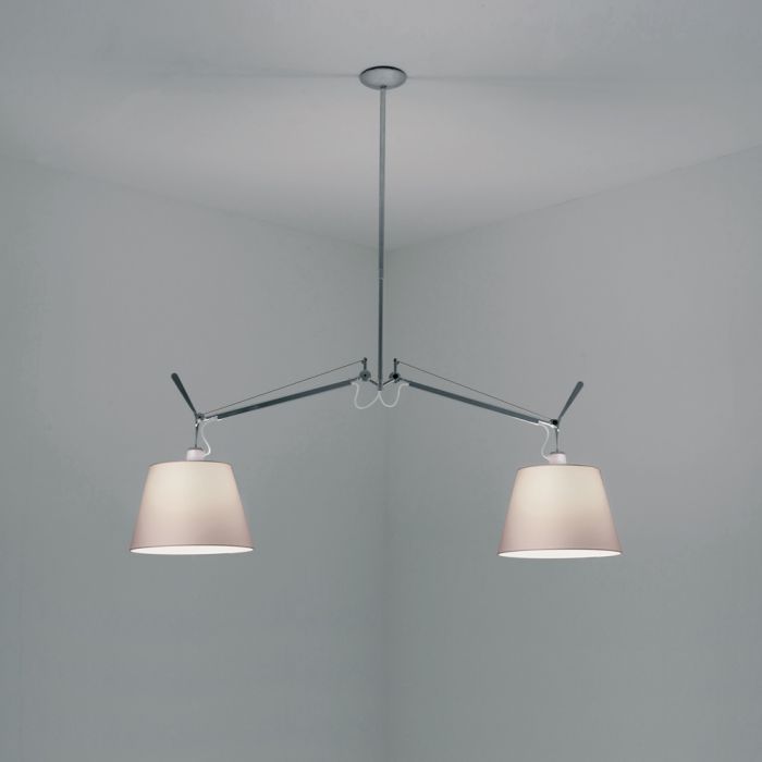 Artemide Tolomeo Double Shade Suspenion Light by Michele De Lucchi and Giancarlo Fassina. The Double Shade Suspension Lamp is part of Artemide's range of Tolomeo Lights. The double-suspended Tolomeo light with two lamp shades available in either a Parchment Shade (light cream) or Fiber Shade (pale grey satin). Tolomeo Double Shade features adjustable arms and shades on a telescoping stem to accommodate a range of ceiling heights. It mounts to a standard electrical ceiling junction box.
