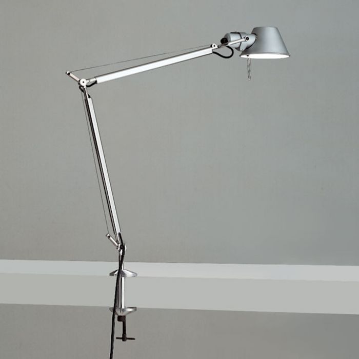 Artemide Tolomeo Mini with table clamp. The Tolomeo Mini lamp was designed by Michele De Lucchi and Giancarlo Fassina for Artemide in Italy. The Tolomeo Mini lamp is the medium version in the Tolomeo lamp series. It is 20% smaller than the Tolomeo Classic lamp. Body structure is made in anodized aluminum and, is available in black or white finish as well. Diffuser is in matte anodized aluminum or black or white. Cables are stainless steel.