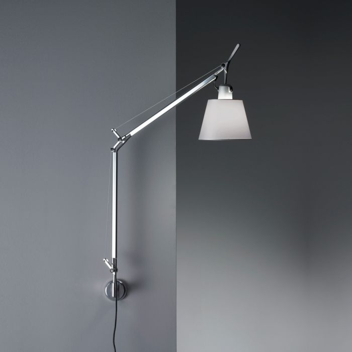 Artemide Tolomeo wall lamp with arms & 7 1/4" diameter shade. Artemide's Tolomeo with Shade is a very functional modern wall light. The fully adjustable arm design puts light exactly where you need it. Place the Artemide Tolomeo wall lamp behind the sofa and move it to just the right place for your book, place one behind the bed for easy night time reading or position one on the wall above a beautiful work of art.