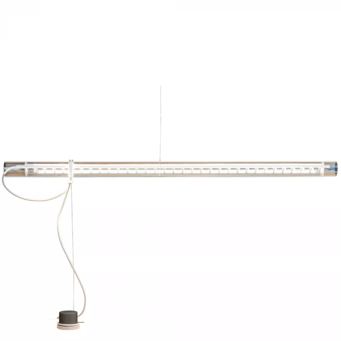 Tubular Balance does not require a ceiling outlet, but can be connected to a socket. It hangs from the ceiling on a thin cable and is combined with a lamp base as a counterweight. This keeps the glass tube suspended by means of a pull cord.