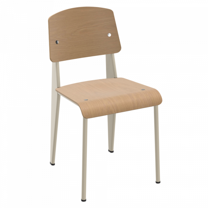 Jean Prouve Standard Chair with natural oak seat and backrest. The Standard Chair is one of the undisputed icons of early mid century modern furniture design. Jean Prouve's Standard Chair is perfect as a dining room chair, living room chair or accent chair. A classic modern chair that enhances any environment, Jean Prouve's side chair remains one of the most successful fixtures of mid-century design. Browse our site for other dining room furniture from the Vitra Jean Prouve collection which includes dining room tables, coffee tables, side chairs and chaise lounges.